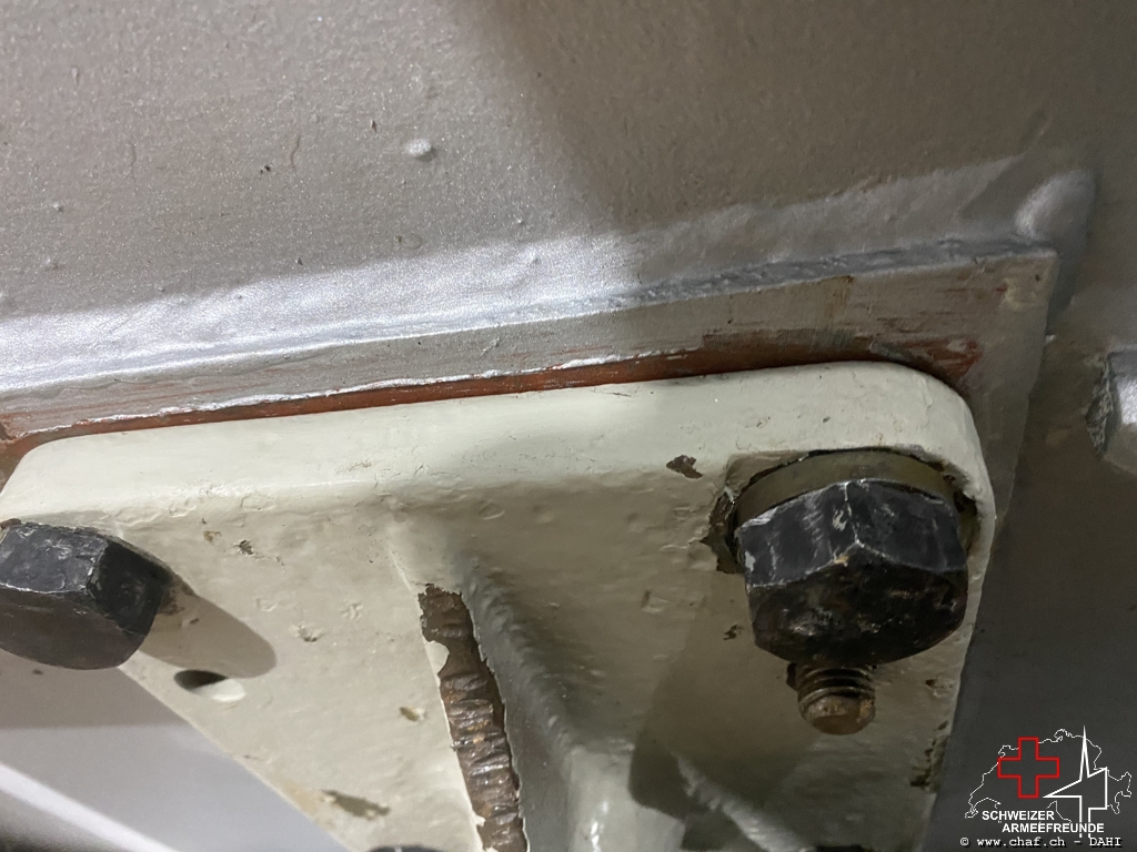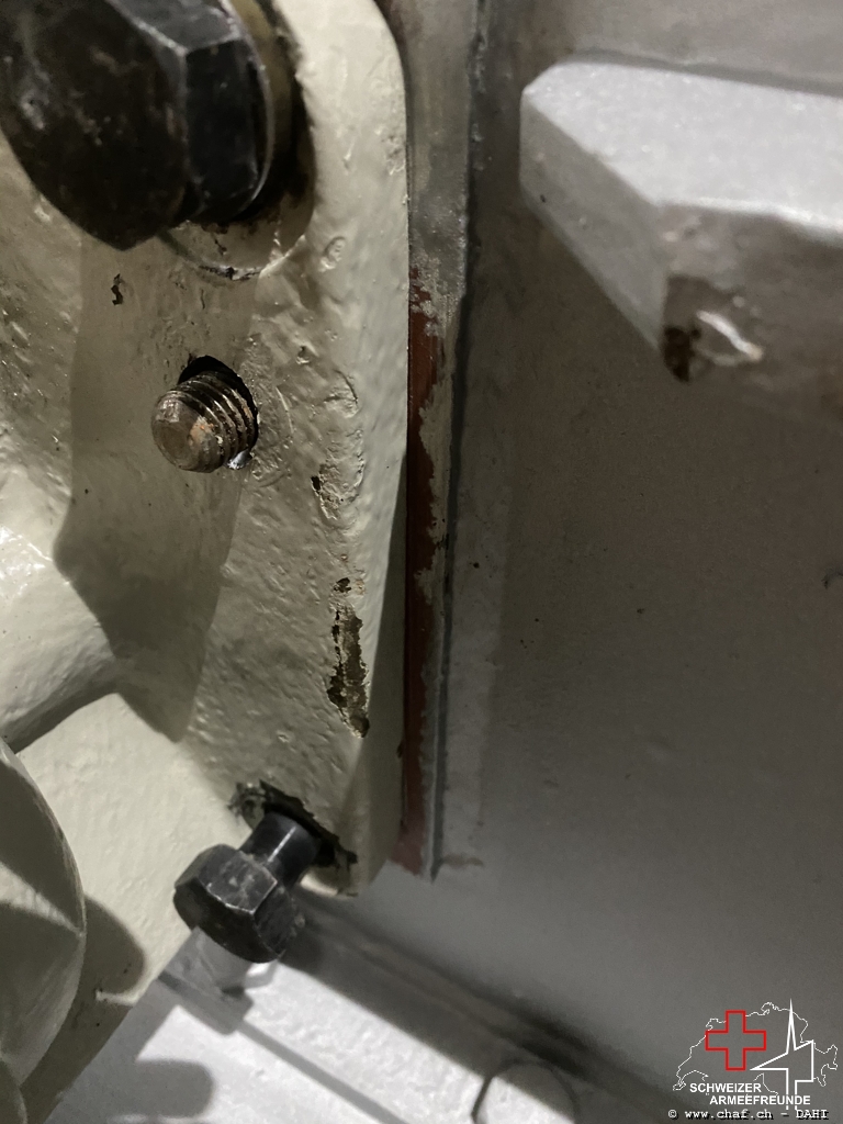 Doch so einfach liess sich das Geschütz nicht einbauen, denn schon bei der Befestigung der oberen Halterung trat ein Problem auf. Die vier Schrauben inklusive dem Sicherheitsbolzen passten nicht in die dafür vorgesehenen Löcher der Platte. Und so verbrachten Tobias und Daniel praktisch den ganzen Morgen damit die Platte anzupassen, um mit dem weiteren Einbau fortfahren zu können. Eine moralische Unterstützung erhielten die zwei beim Mittagessen durch die M&Ms (Marc & Marc), die die selbe Leidenschaft in Sachen Bunker und Festungen an den Tag legen. Dazu wurde der Mannschaftsraum gemütlich mit original Tisch und Bänken hergerichtet, wo die vier dann das Mittagessen einnahmen.