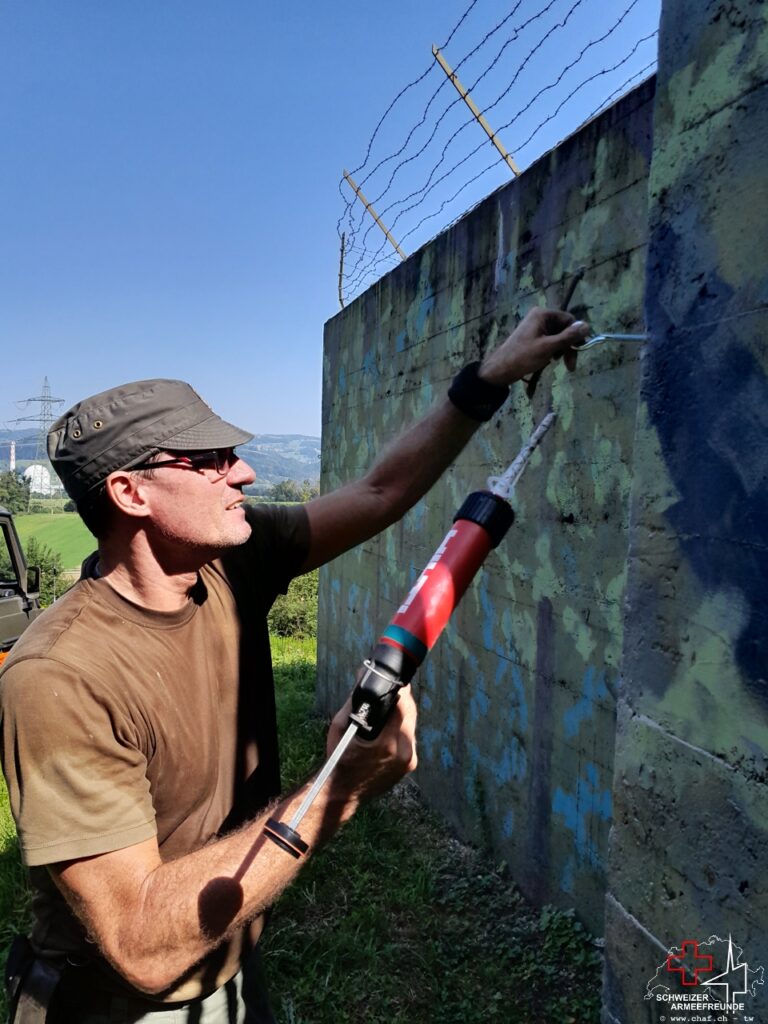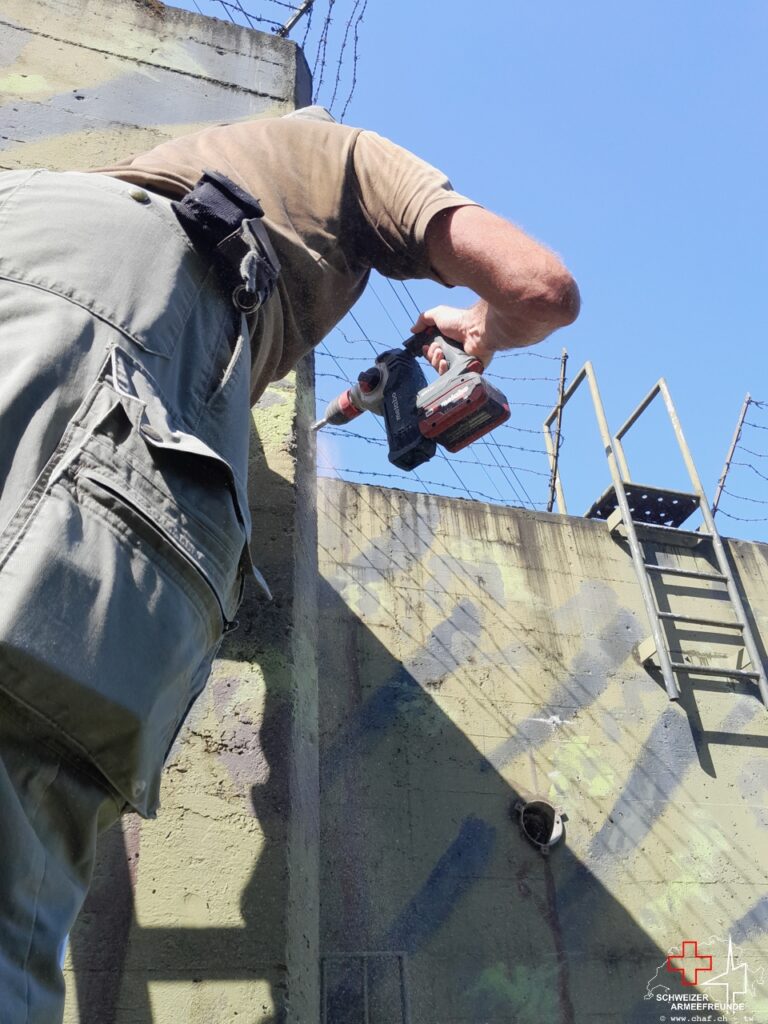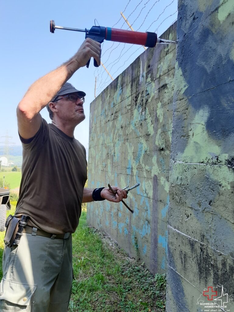 Am 14. August dann starteten wir mit der Vorbereitung zur Montage der «Krone». Diese besteht aus Stacheldraht und umgibt die Aussenseiten des Bunkers mit einer Breite von ca. 1 ½ m unterhalb Oberkannte Bunkerdach. Diese sollte das Aussteigen auf das Bunkerdach des Gegners verhindern oder zumindest erschweren.