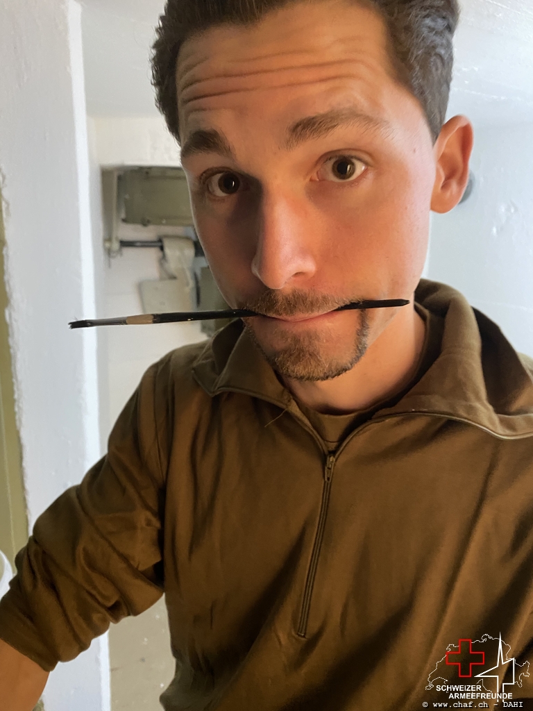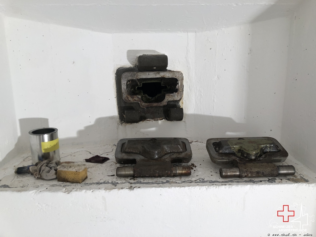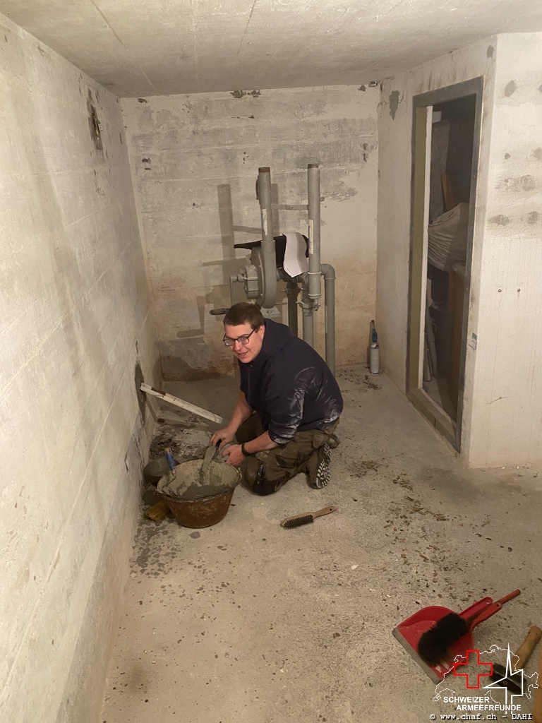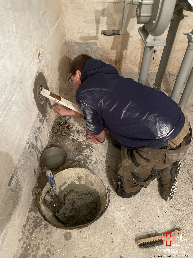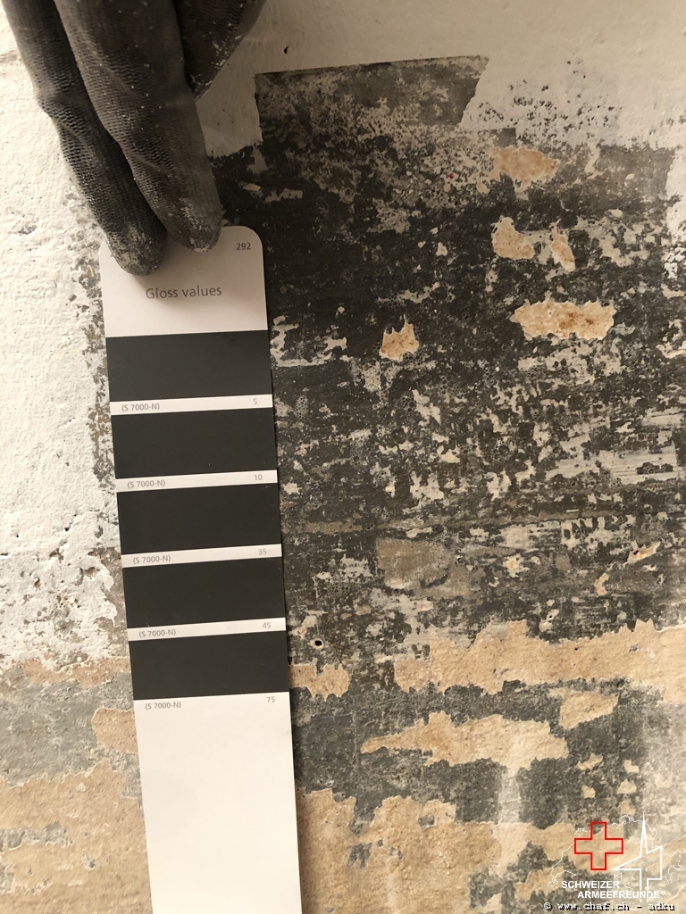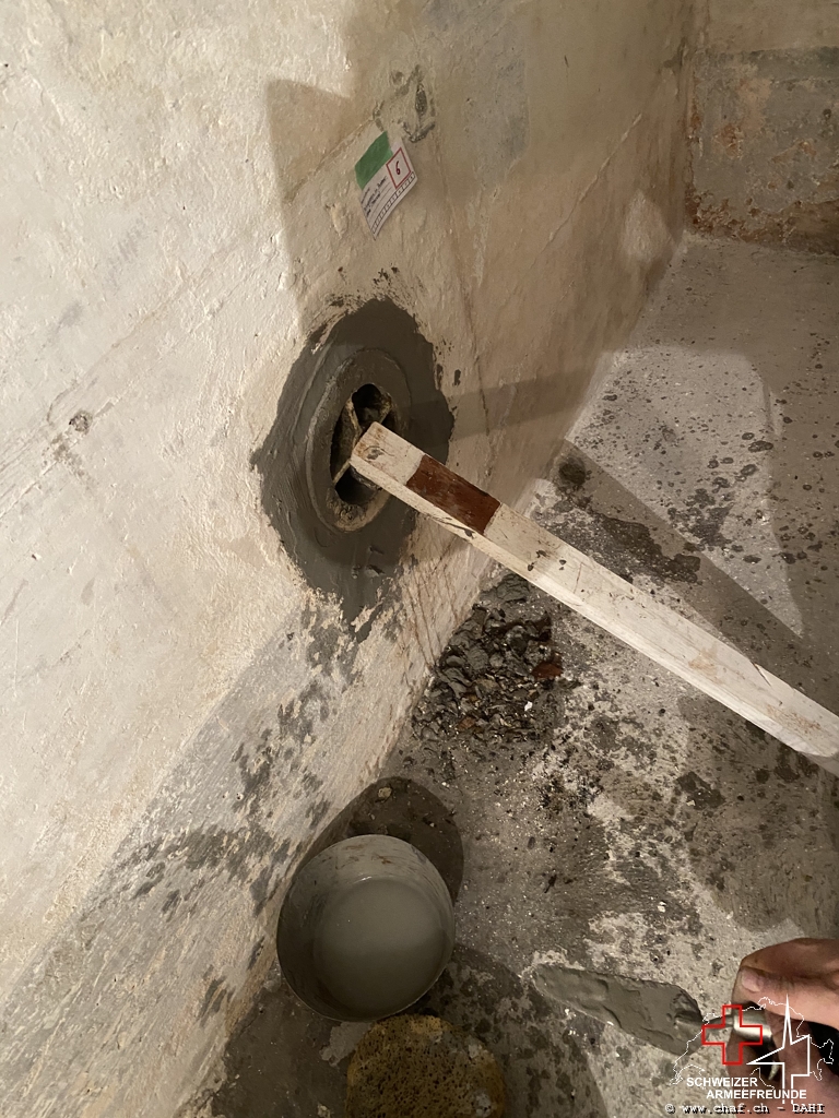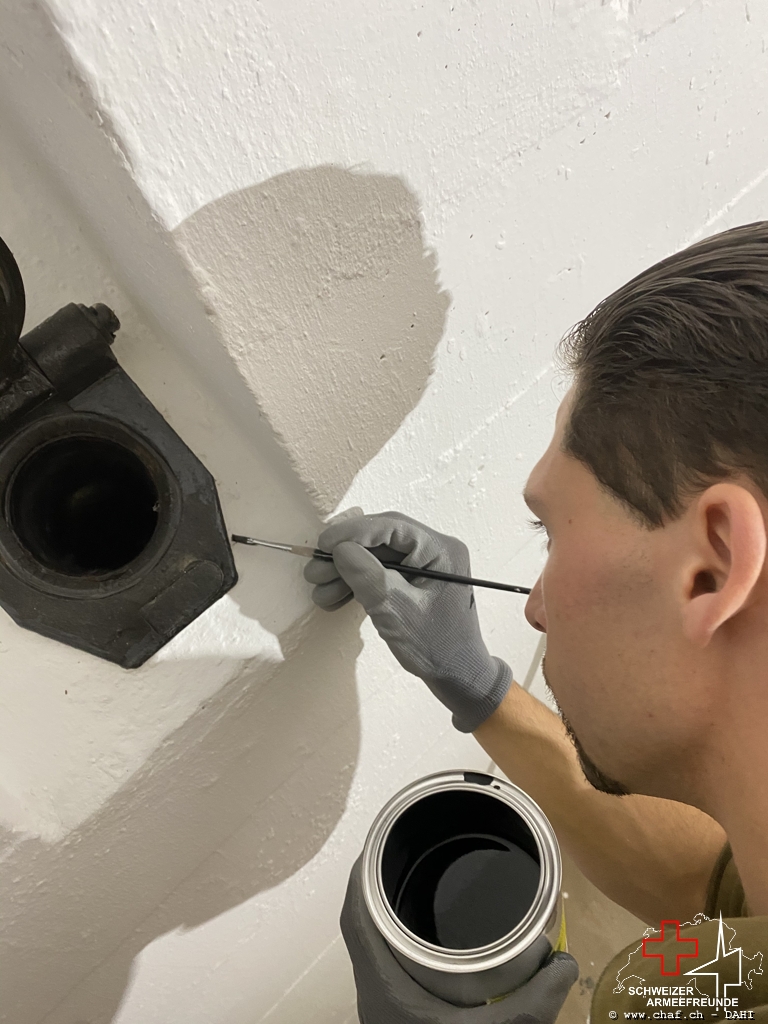 Am zweiten Tag des Grossen Streichens stand auch das einmauern der Lüftungssockel an, dass durch Tobias sehr kompetent ausgeführt wurde. In der Zwischenzeit strichen Timo und Daniel weiter den Kampfraum und die Mannschaftsunterkunft. Adrian widmete sich der weiteren Analysen der Farben um den Sockel, die HG-Auswürfe, die MG- und PAK Lafetten und die Türen, Türrahmen irgenwann mit der richtigen Farbe zu “bepinseln”.