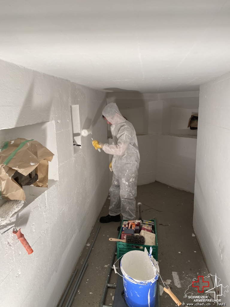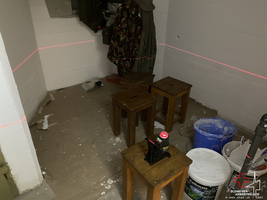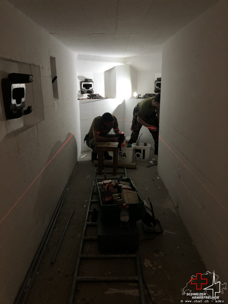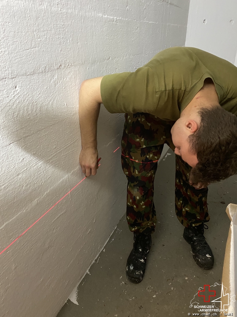 Timo und Daniel gaben nochmals alles, die Mannschaftsunterkunft ein zweites Mal zu streichen. Adrian brachte zu seiner Verstärkung Raphi mit, der ihn bei der Säuberung und der Feinbemalung der HG Auswürfe und LMG Scharten tatkräftig unterstützte. Am Nachmittag konnten Timo und Daniel dann den Strich für den grauen Sockel mittels einem Lasergerät anzeichnen.