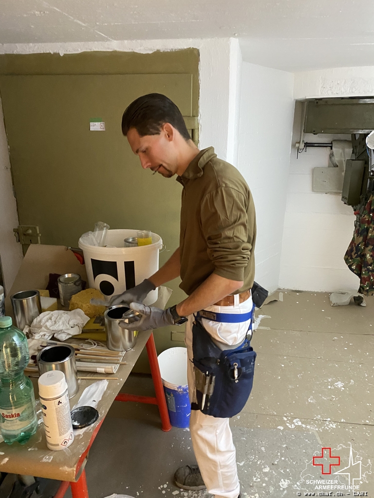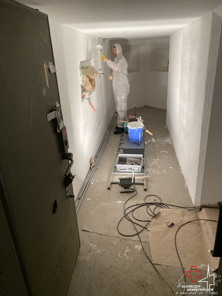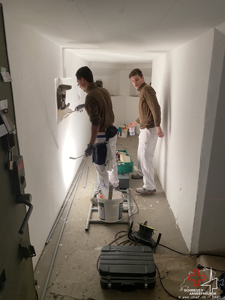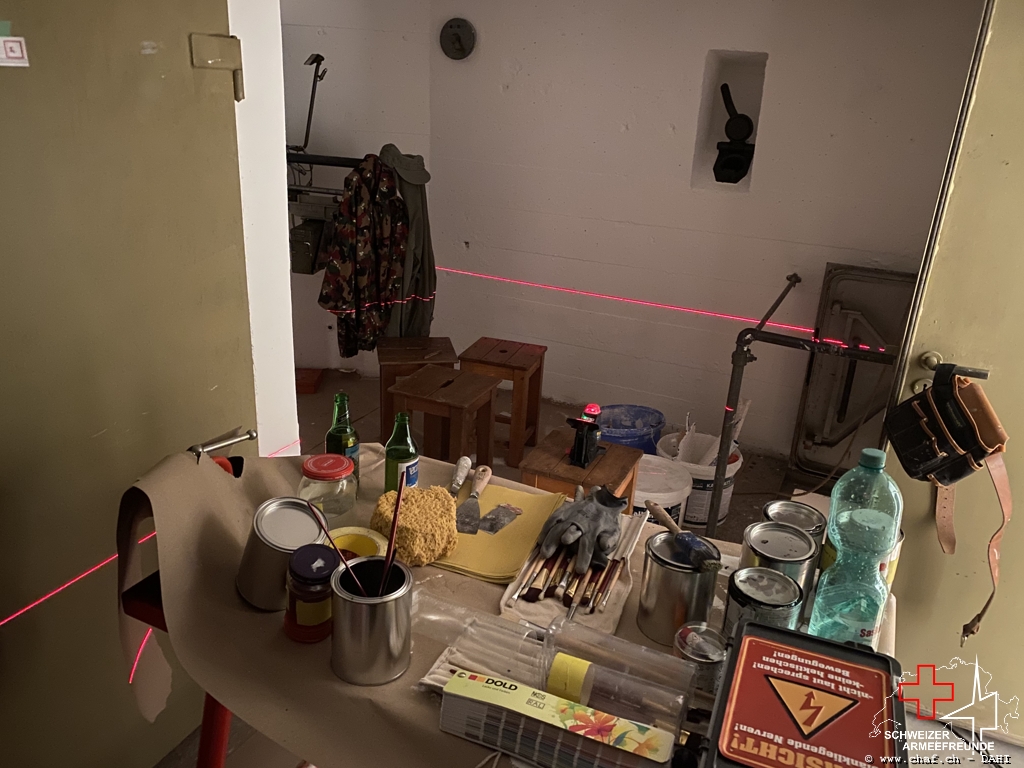 Timo und Daniel gaben nochmals alles, die Mannschaftsunterkunft ein zweites Mal zu streichen. Adrian brachte zu seiner Verstärkung Raphi mit, der ihn bei der Säuberung und der Feinbemalung der HG Auswürfe und LMG Scharten tatkräftig unterstützte. Am Nachmittag konnten Timo und Daniel dann den Strich für den grauen Sockel mittels einem Lasergerät anzeichnen.