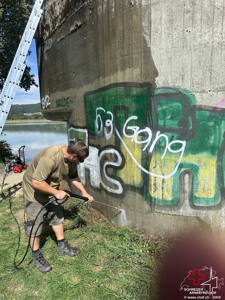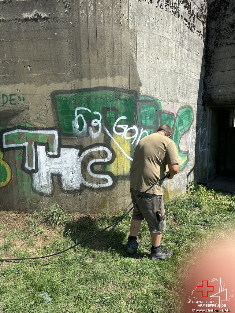 An diesem Arbeitssamstag wurde die “Aussenhülle” des Bunkers in Angriff genommen. Der Versuch stand an, ob wir mit dem Hochdruckreiniger die lästigen Graffiti entfernen können. Dies funktionierte leider nicht, doch wir konnten einen Teil der Aussenwände trotzdem von Dreck und Moos befreien.