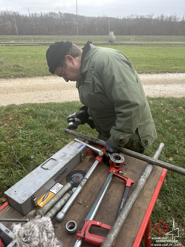 Da die Arbeiten am Tank-Leitungen am Nachmittag früher abgeschlossen werden konnten, entschlossen sich die zwei in den Aussenlagern noch auf „Raubzug“ zu gehen. Wasserrohr ¾ Zoll für die Leitungen in den Kampfraum und weiteres Kleinteilmaterial wird noch benötigt.