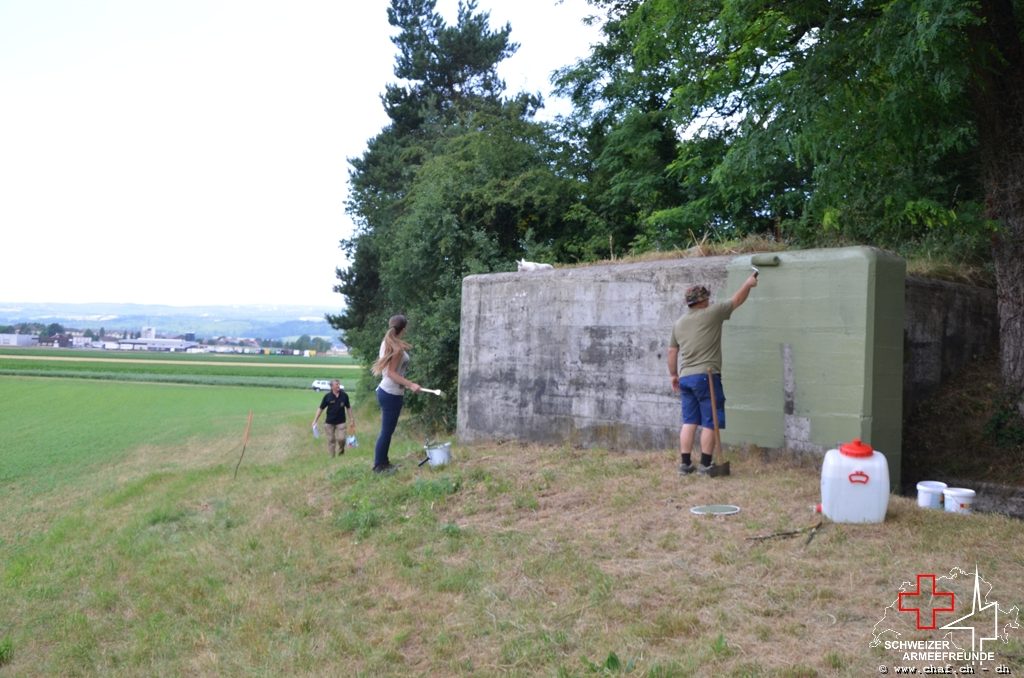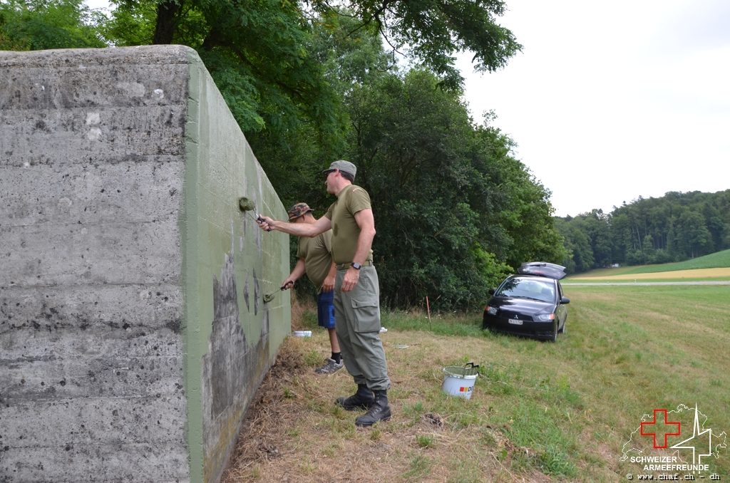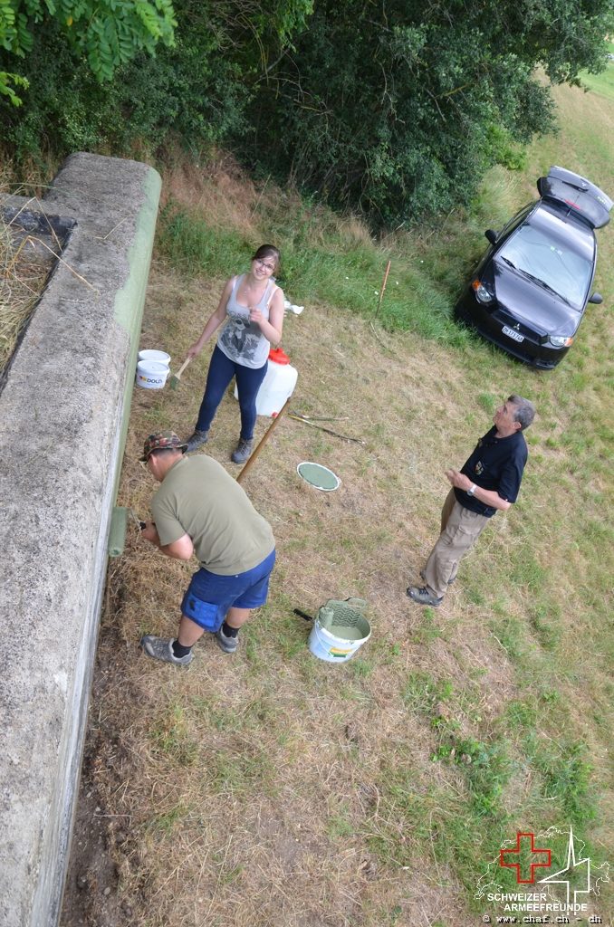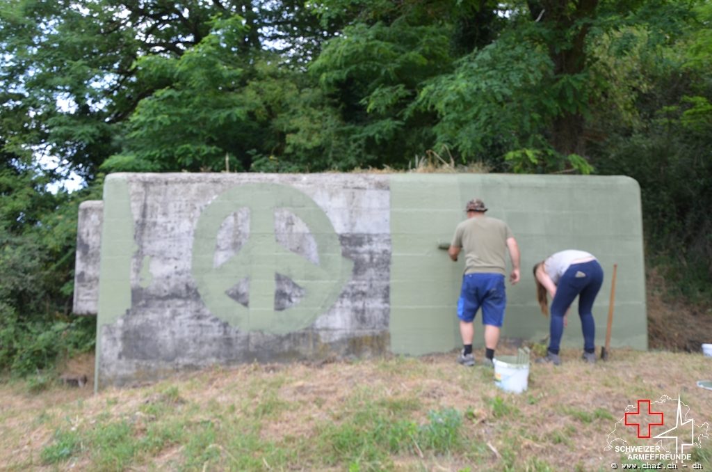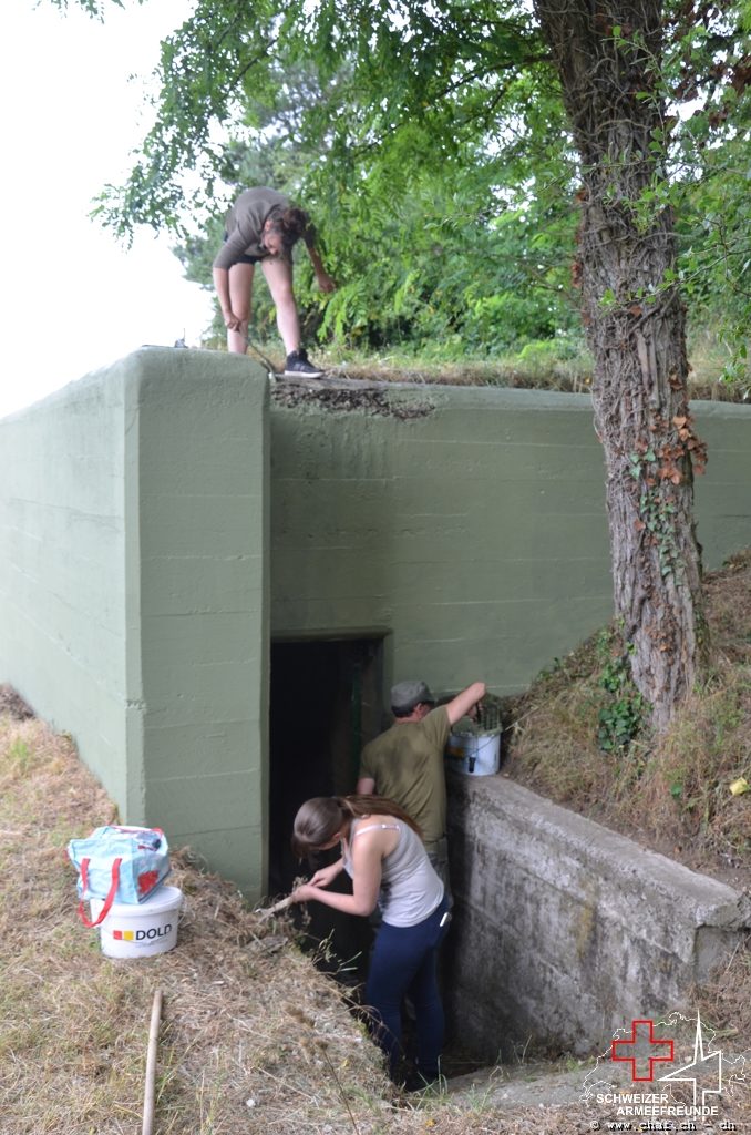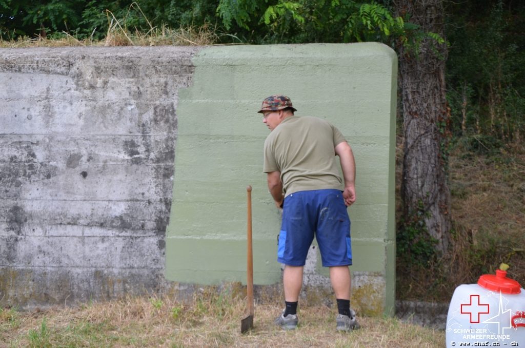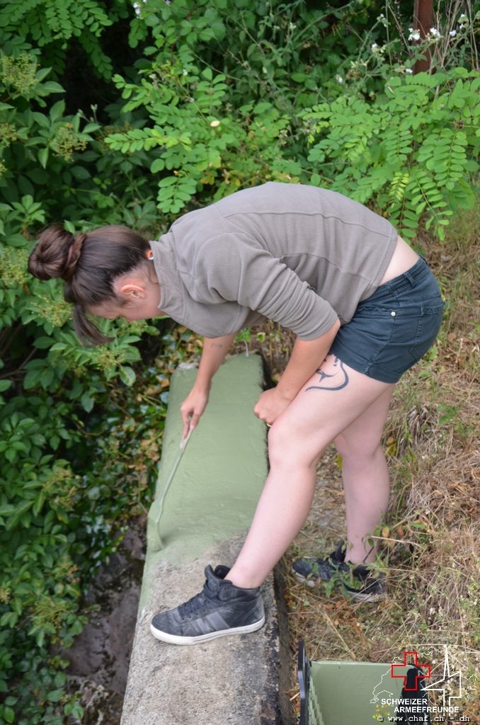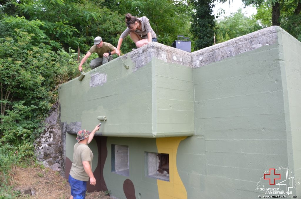In einen ersten Schritt wurden die noch vorhandenen Tarnmuster im Schartenbereich nachgezogen und den Rest des Bunkers mit Tiefgrund vorbereitet.