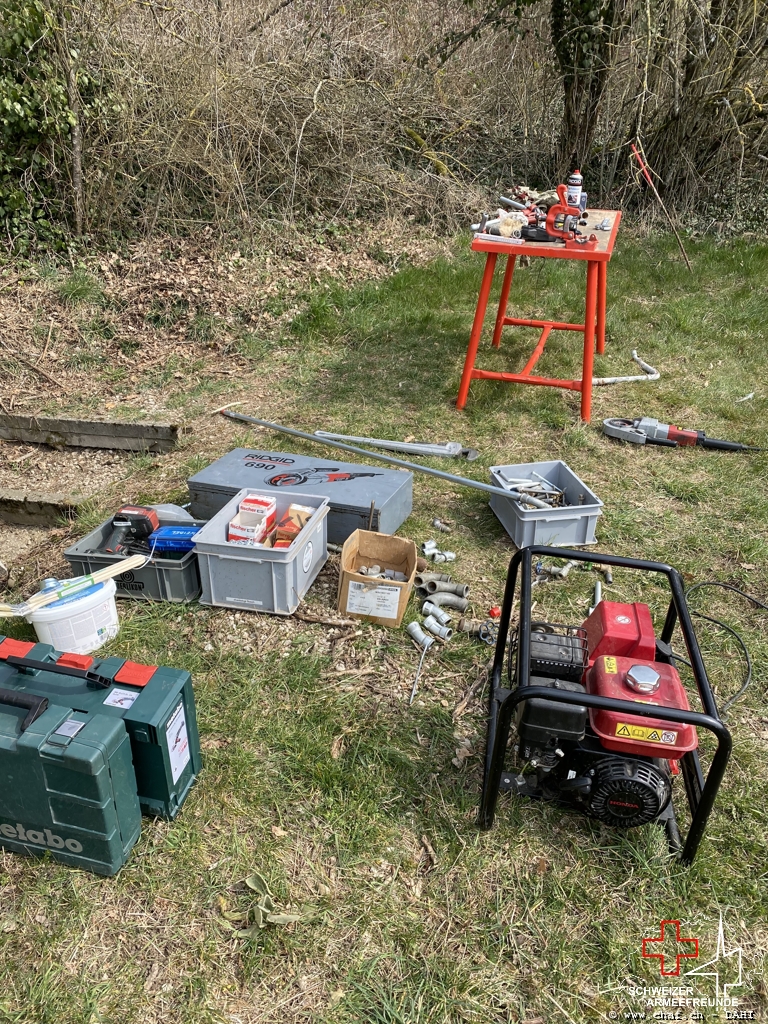 Im Peterlibuck stand die Wasserleitung des Wassertanks im UG auf dem Programm. Weiter wurde auch die Kühlwasserleitung des MG erweitert. Auch die gemauerten Stellen der Tanks und Kollektivrohrdurchbrüche wurden weiss gemalt.