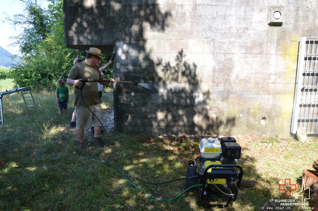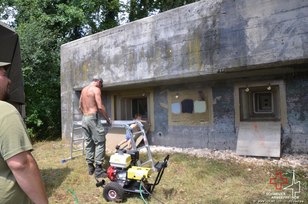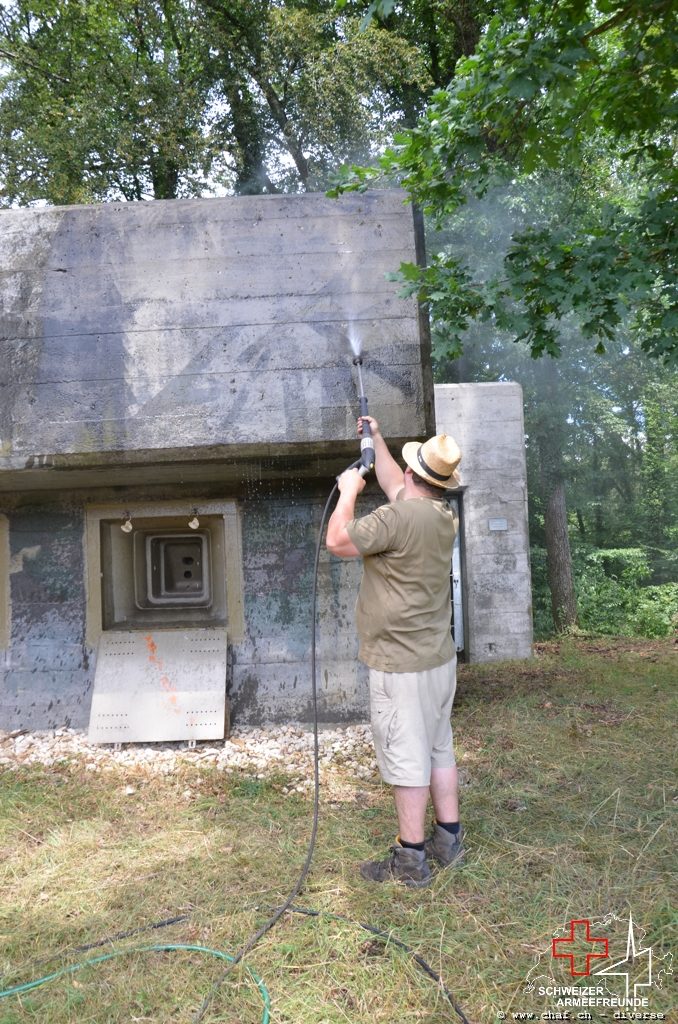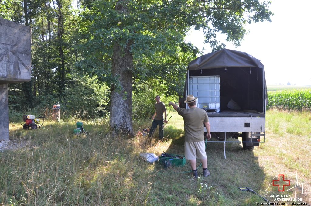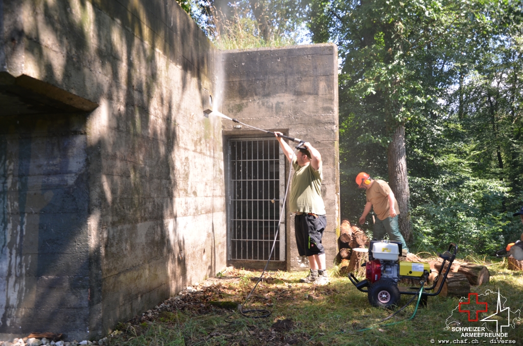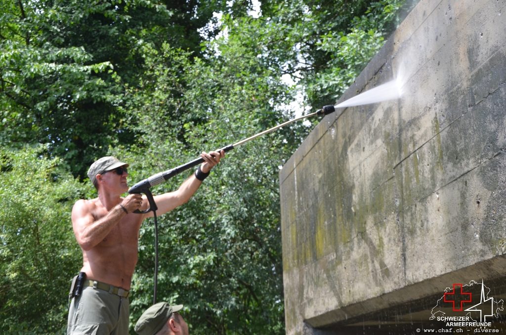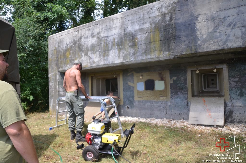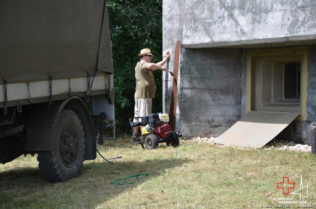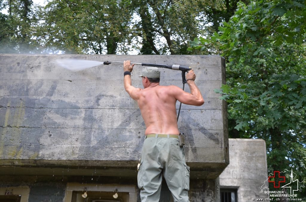 Equipé d’un réservoir d’eau de 1’000 litres sur le CHAF-Steyr de Tobias et d’un système d’eau à haute pression Kärcher, qui est entraîné par un agrégat d’essence et bien sûr les dames diligentes Linda et Ramona avec la brosse en acier pour les endroits spéciaux, nous avons pu libérer le bunker de 70 ans de terre en une seule journée.