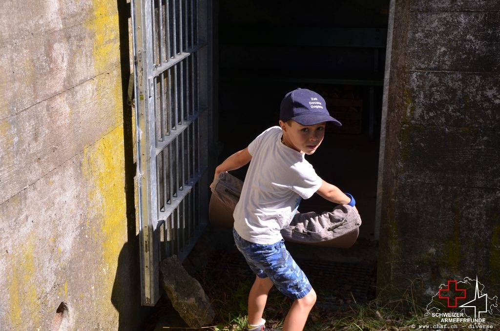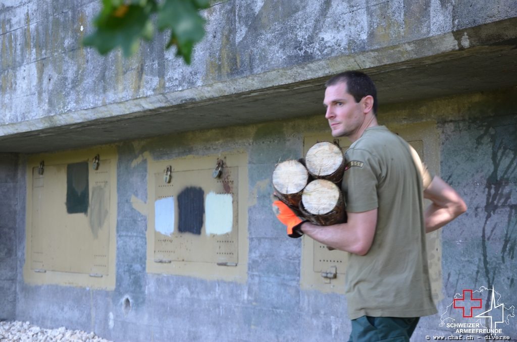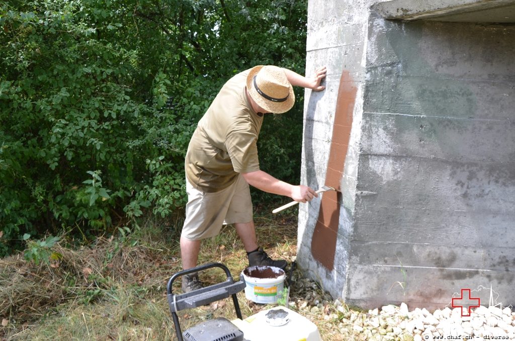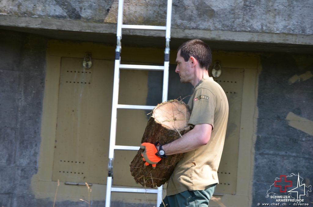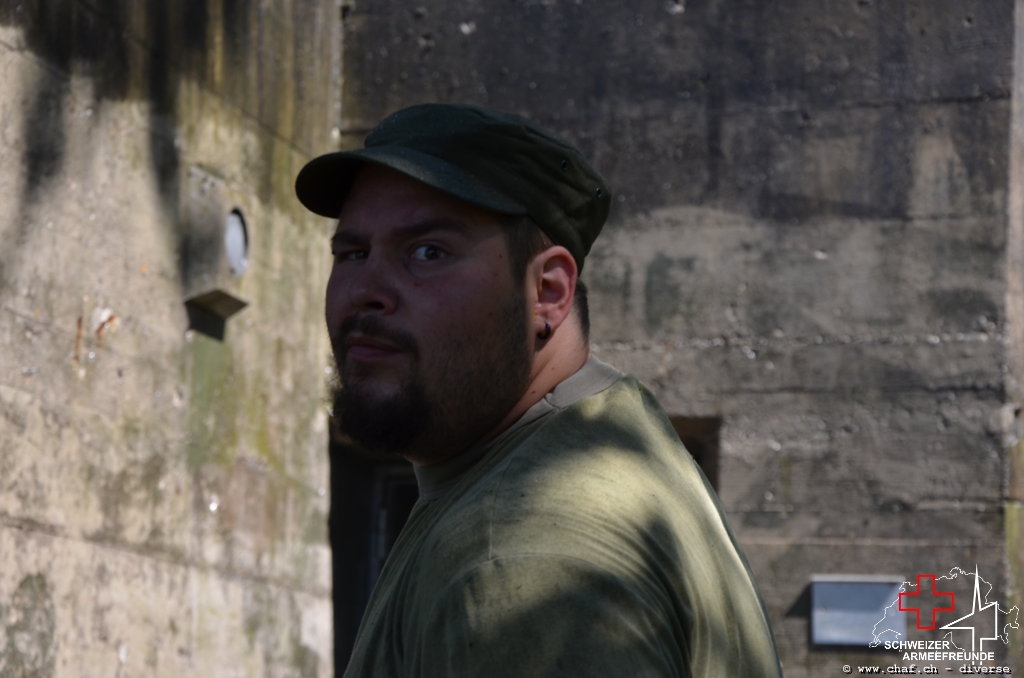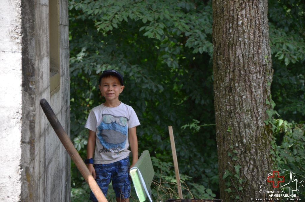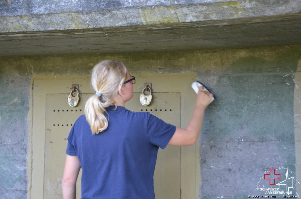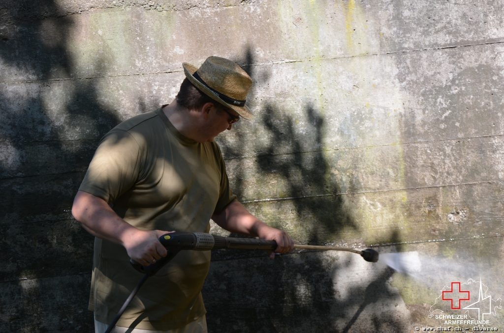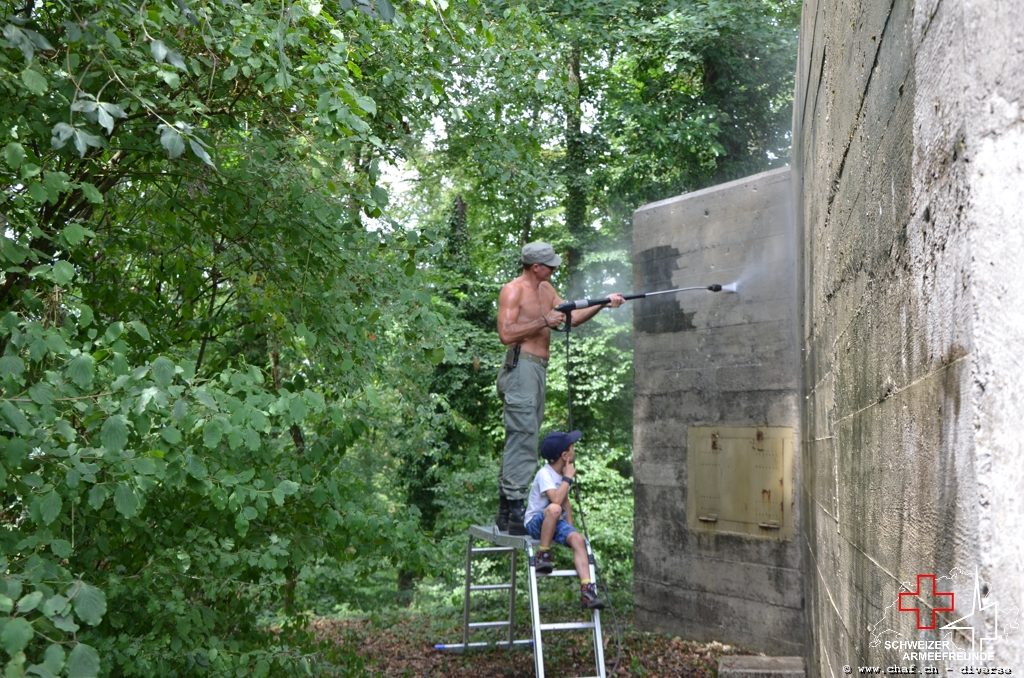 Equipé d’un réservoir d’eau de 1’000 litres sur le CHAF-Steyr de Tobias et d’un système d’eau à haute pression Kärcher, qui est entraîné par un agrégat d’essence et bien sûr les dames diligentes Linda et Ramona avec la brosse en acier pour les endroits spéciaux, nous avons pu libérer le bunker de 70 ans de terre en une seule journée.