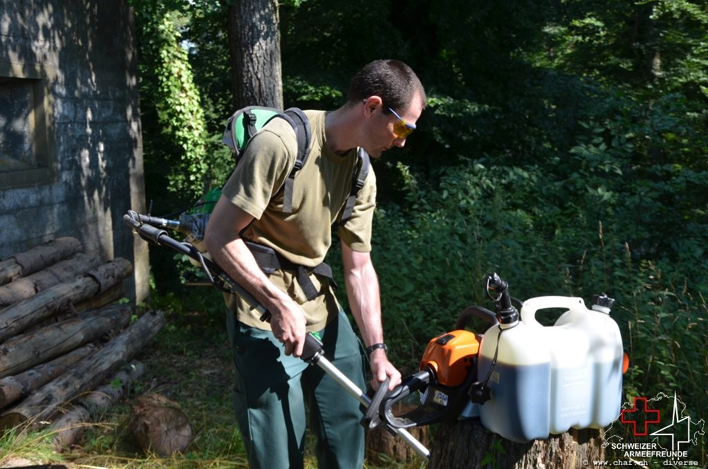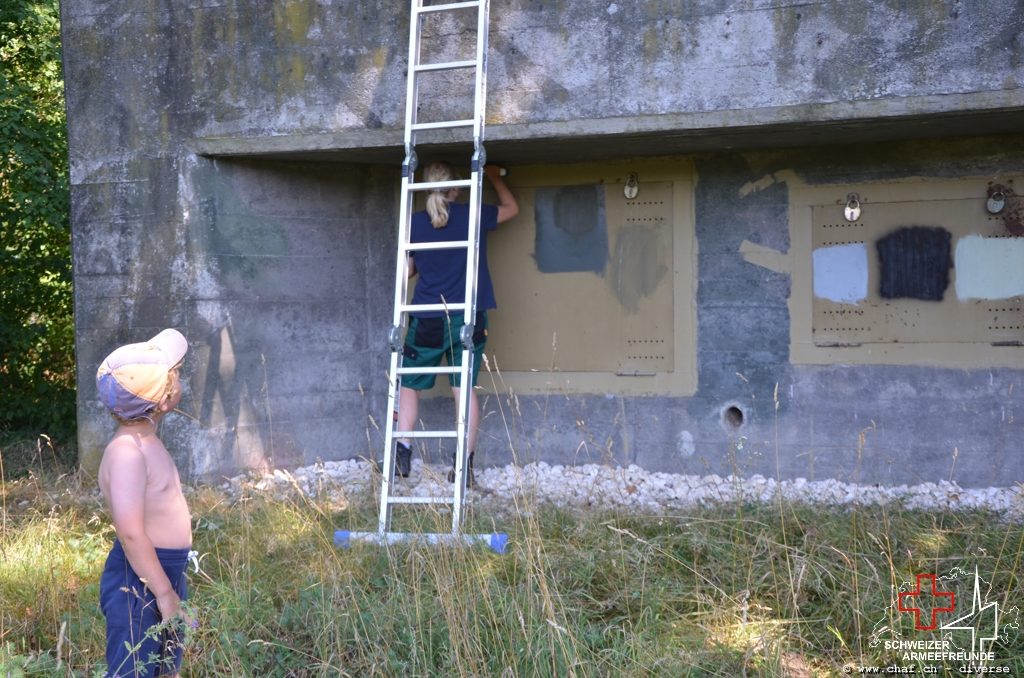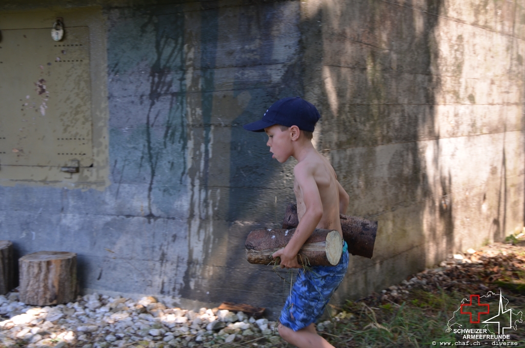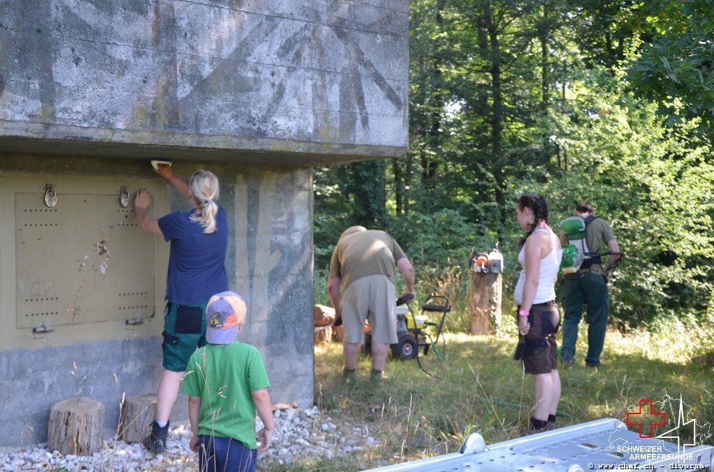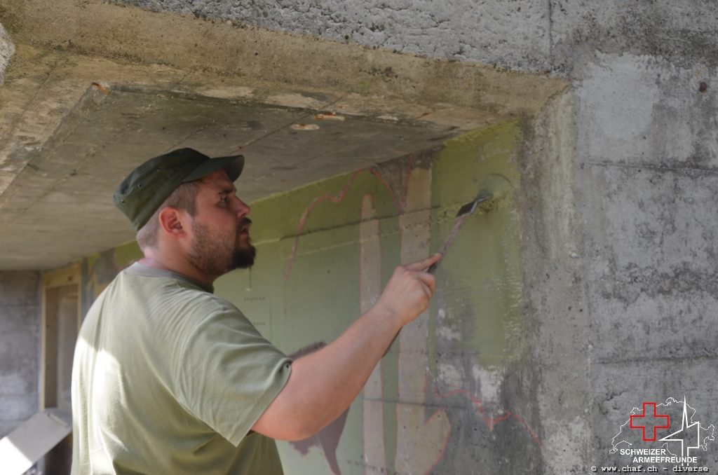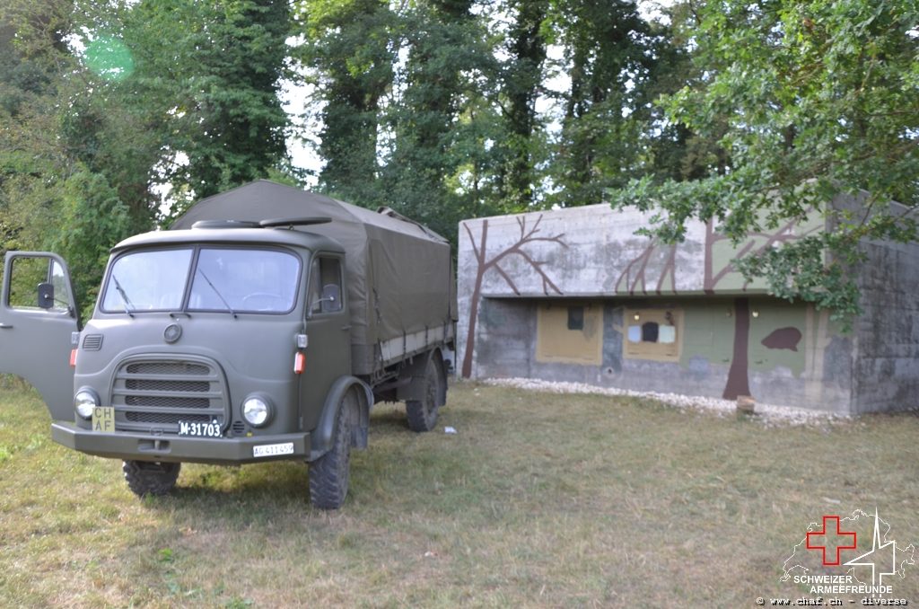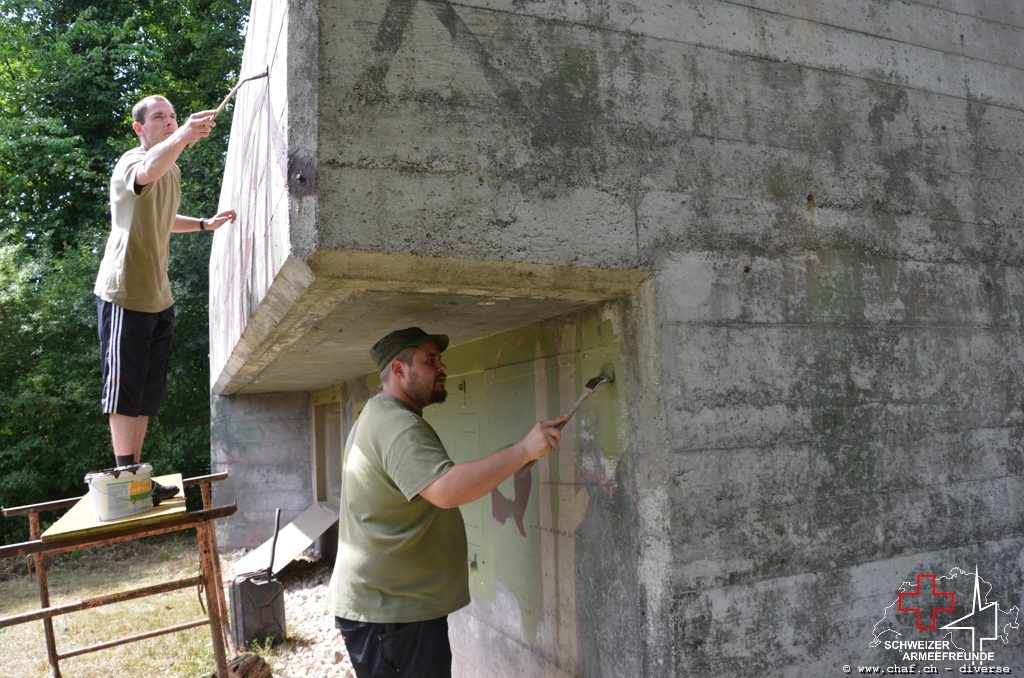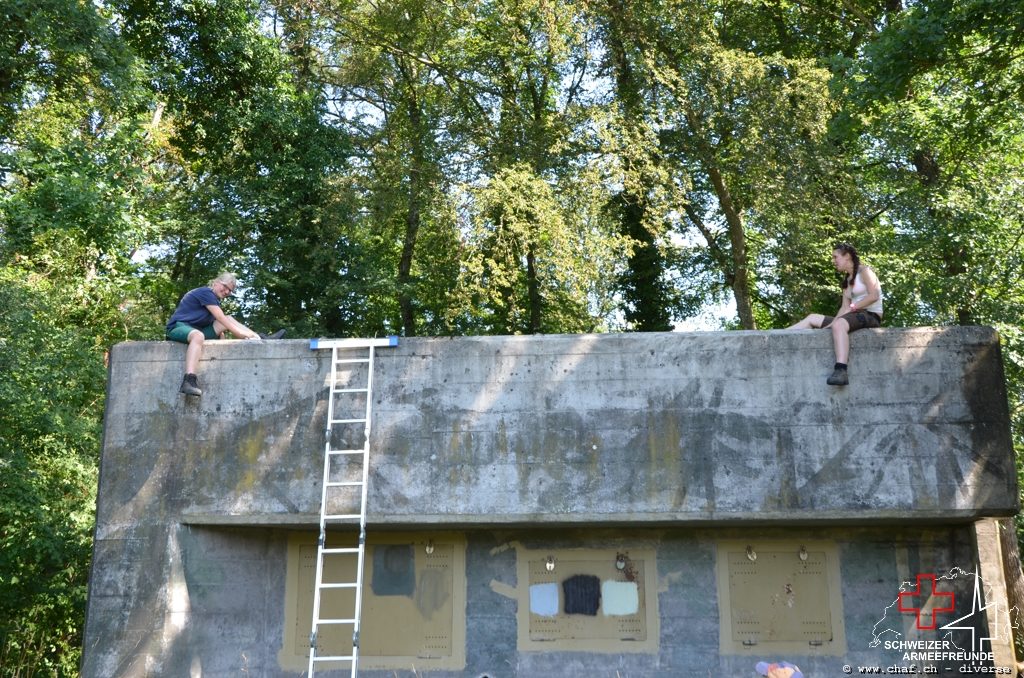 Equipé d’un réservoir d’eau de 1’000 litres sur le CHAF-Steyr de Tobias et d’un système d’eau à haute pression Kärcher, qui est entraîné par un agrégat d’essence et bien sûr les dames diligentes Linda et Ramona avec la brosse en acier pour les endroits spéciaux, nous avons pu libérer le bunker de 70 ans de terre en une seule journée.