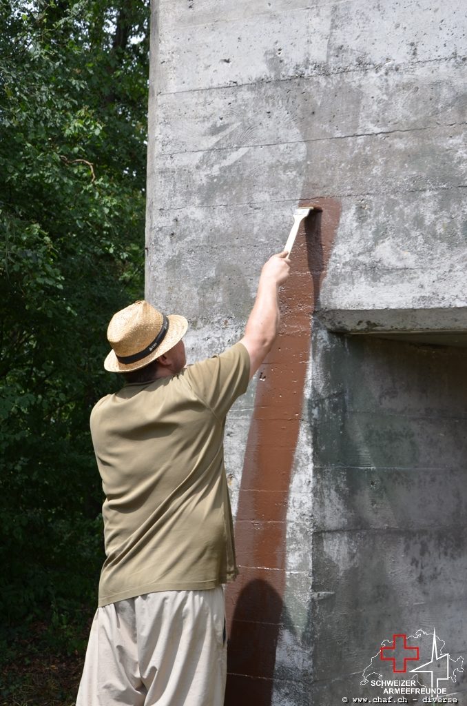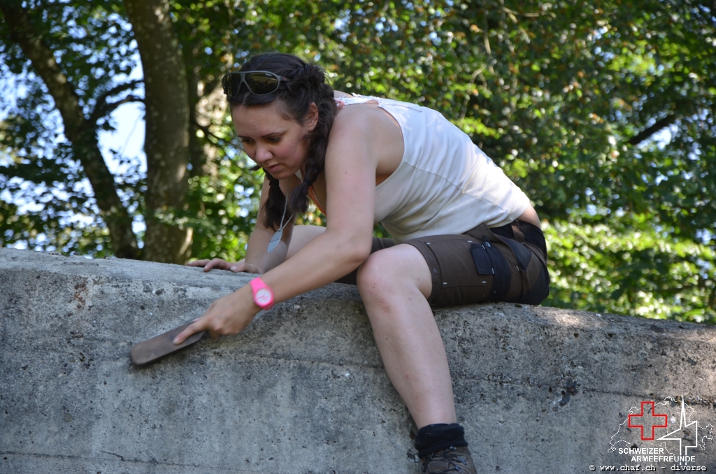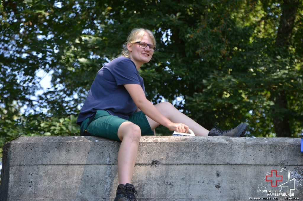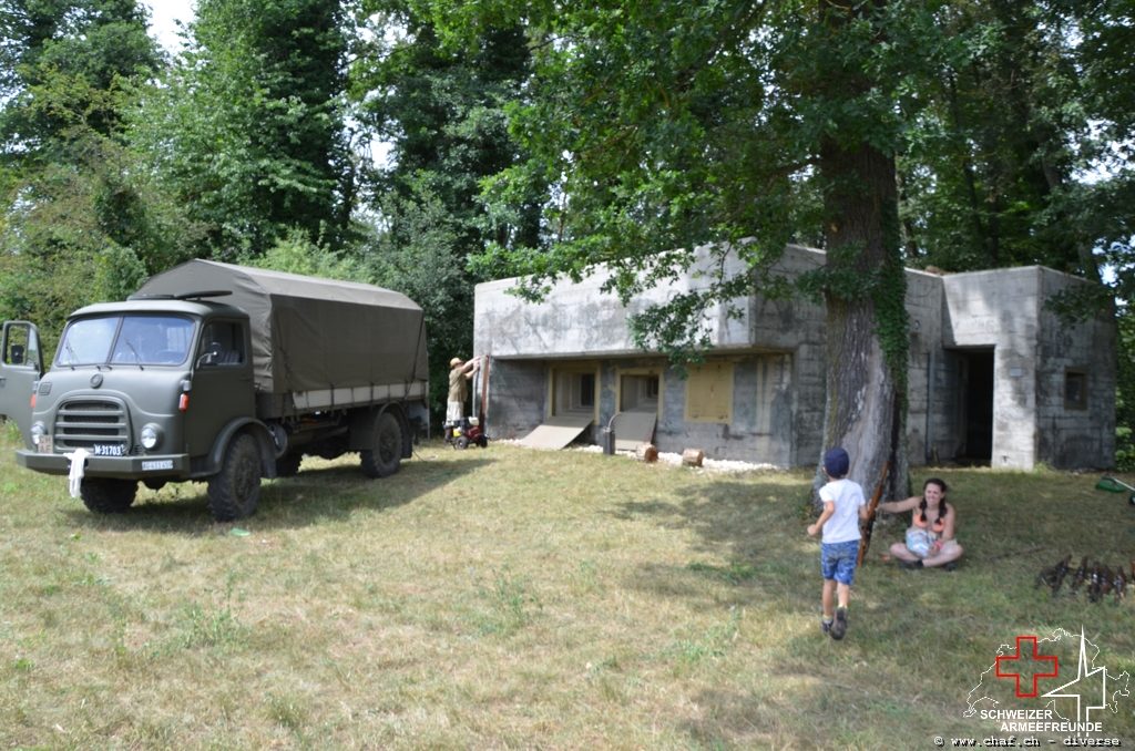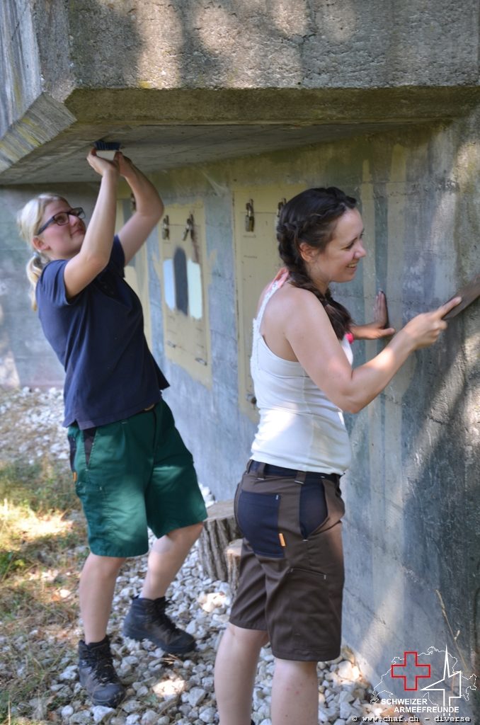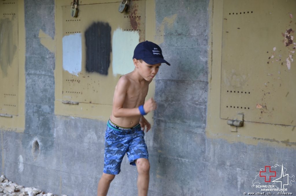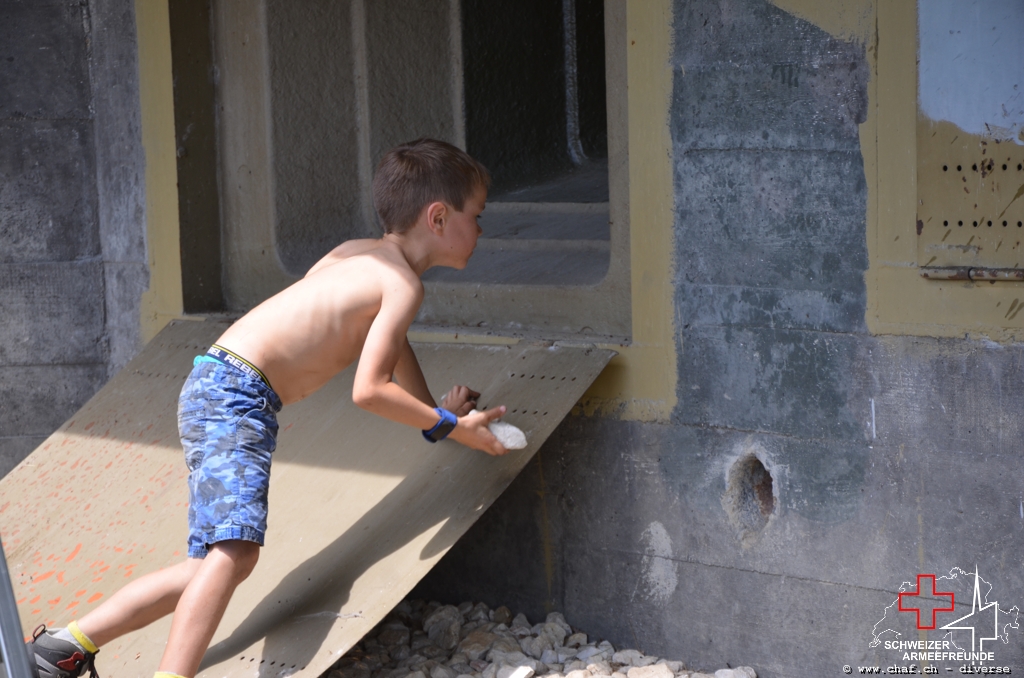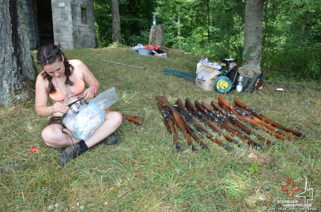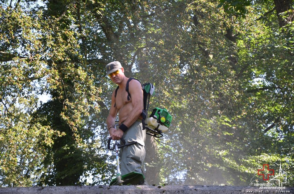 Equipé d’un réservoir d’eau de 1’000 litres sur le CHAF-Steyr de Tobias et d’un système d’eau à haute pression Kärcher, qui est entraîné par un agrégat d’essence et bien sûr les dames diligentes Linda et Ramona avec la brosse en acier pour les endroits spéciaux, nous avons pu libérer le bunker de 70 ans de terre en une seule journée.