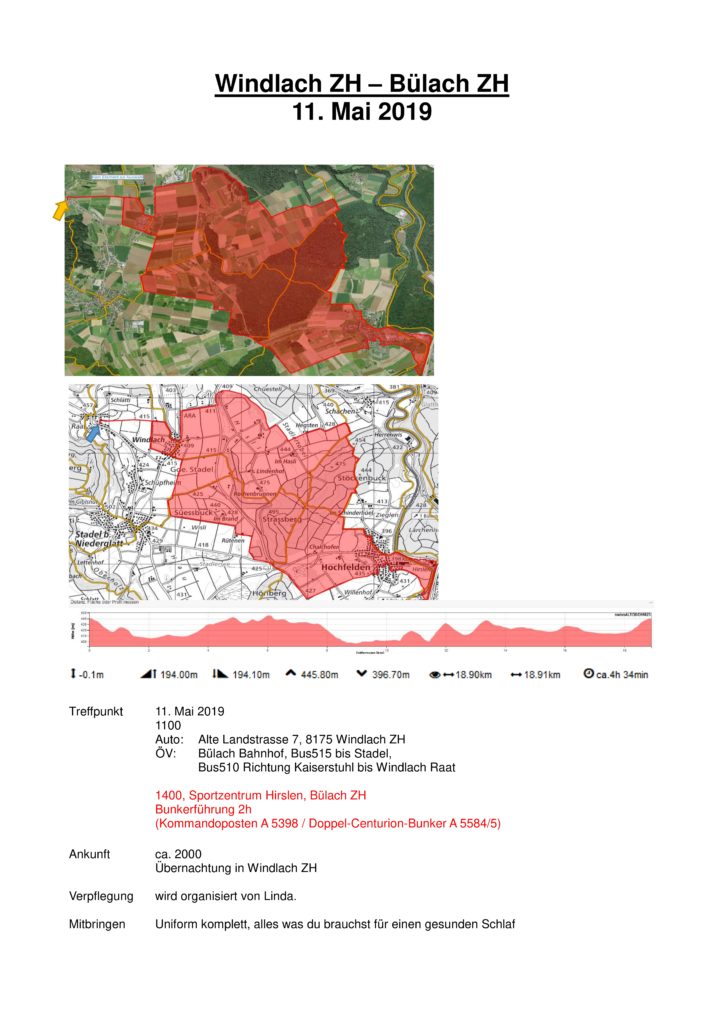 Toute la fin de semaine a été consacrée à l’entraînement de la dernière marche avant la marche proprement dite, les 25 et 26 mai 2019 à Coire. Nous avons donc simulé le week-end à Coire et parcouru 20 km sur chacun des deux jours. Samedi, Linda a trouvé quelque chose de spécial et, vers le kilomètre 12, nous avons fait une visite très intéressante du bunker. Il s’agissait notamment du bunker de commandement A5398 et du bunker Centurion 5584/5 de la brigade frontalière 6. Christian de la Société historique militaire du canton de Zurich (http://www.festungen-zh.ch) nous a expliqué les installations avec beaucoup d’informations générales. Après la visite, le groupe, composé de Daniel, Lukas et Linda, a parcouru les derniers kilomètres. Après une belle fête des spaghettis et une nuit presque trop courte, nous sommes allés dimanche au deuxième tour. Cela a conduit autour de l’aérodrome de Kloten. Avec l’un ou l’autre petit coup de couteau le groupe arriva alors le dimanche après-midi contre 15 à nouveau au point de départ.