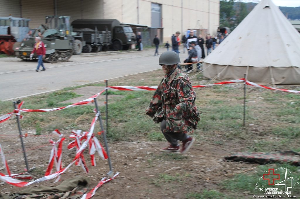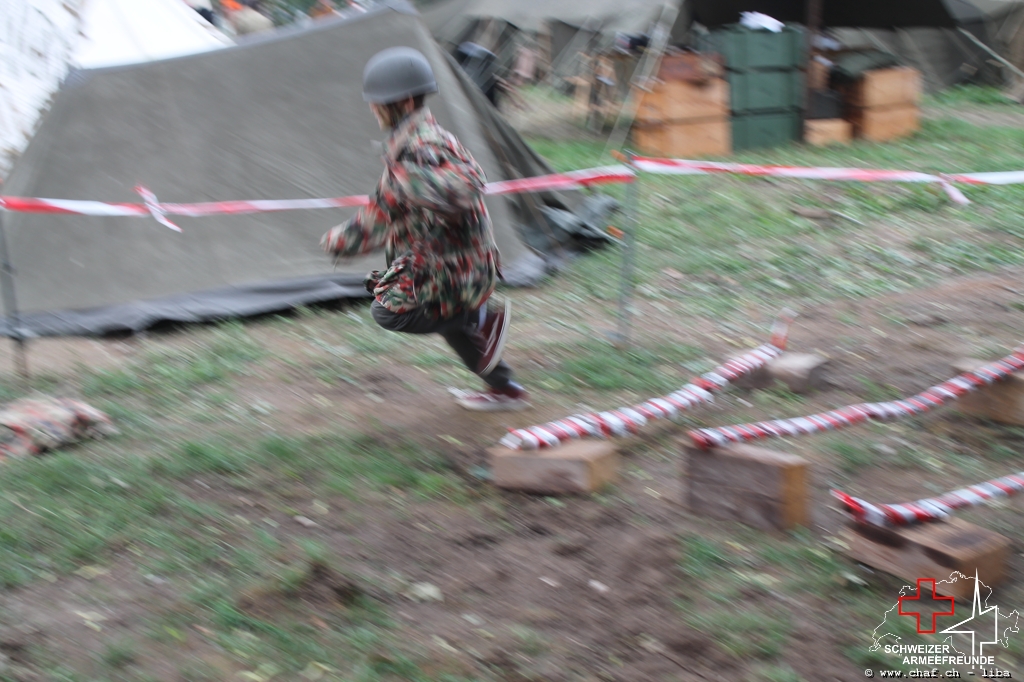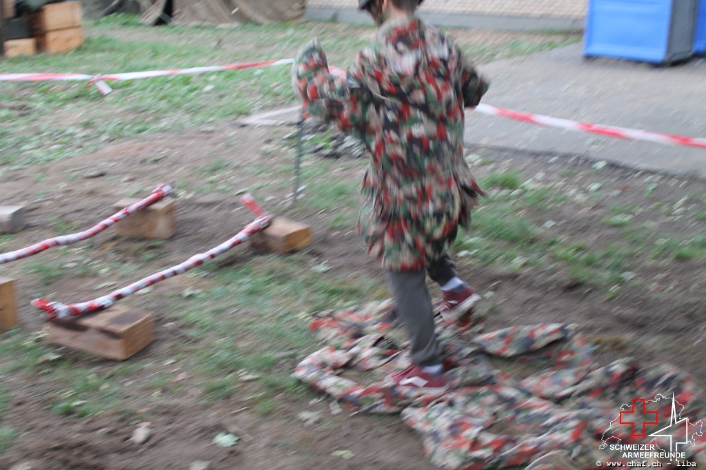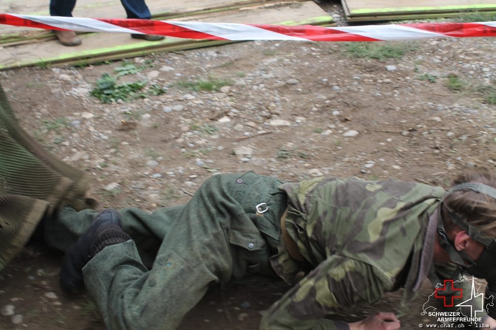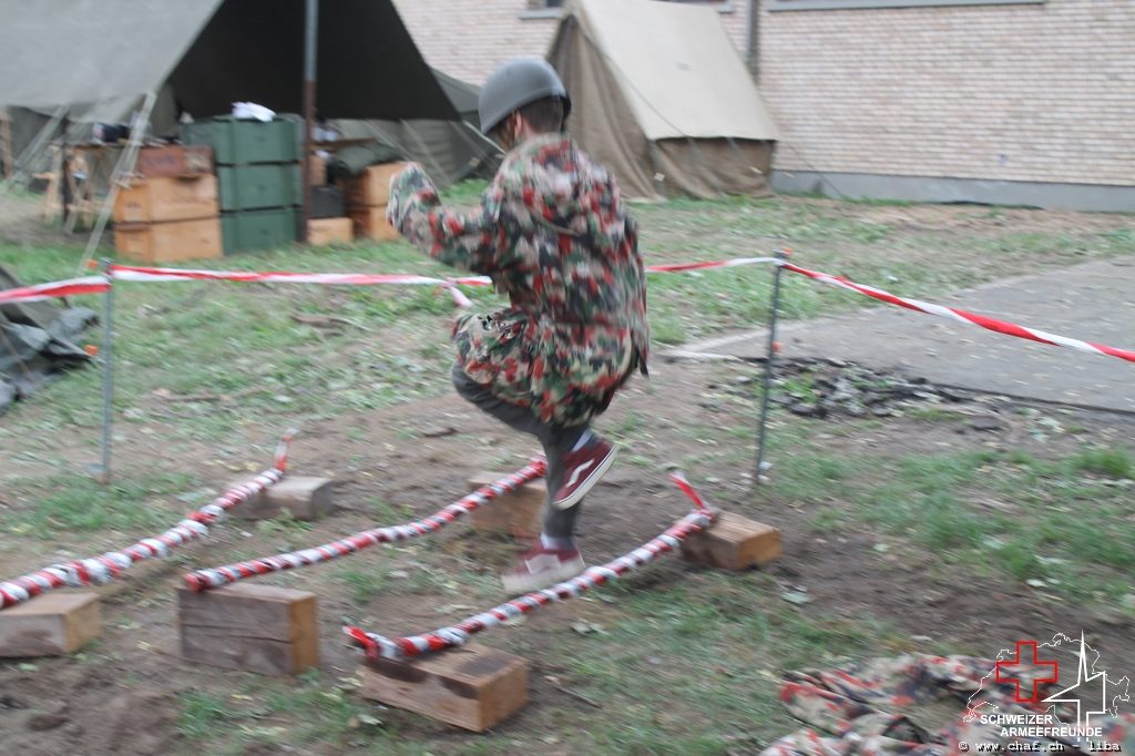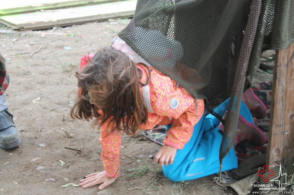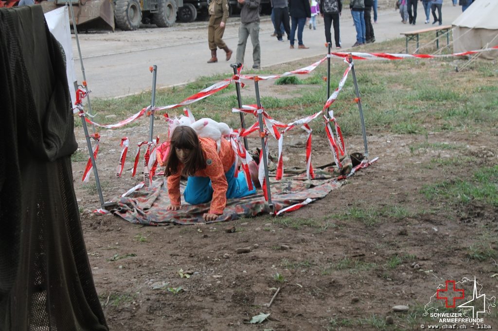 Linda a donc pensé à un HIBA, surtout pour les enfants. Avec le soutien de Ramona (également membre actif de la CHAF) et Katrin, ils ont mis sur pied un parcours d’obstacles qui, comme le montrent les photos, a également été testé par la Wehrmacht et était bien sûr très populaire auprès des petits. L’HIBA se composait de cinq obstacles différents et chaque enfant a reçu une petite gâterie à la fin de la promenade. Pendant la période sans HIBA, les troupes de la FHD ont pratiqué l’auto-assistance et l’aide d’un compagnon, ainsi que divers types de poignées de sauvetage et de transport.