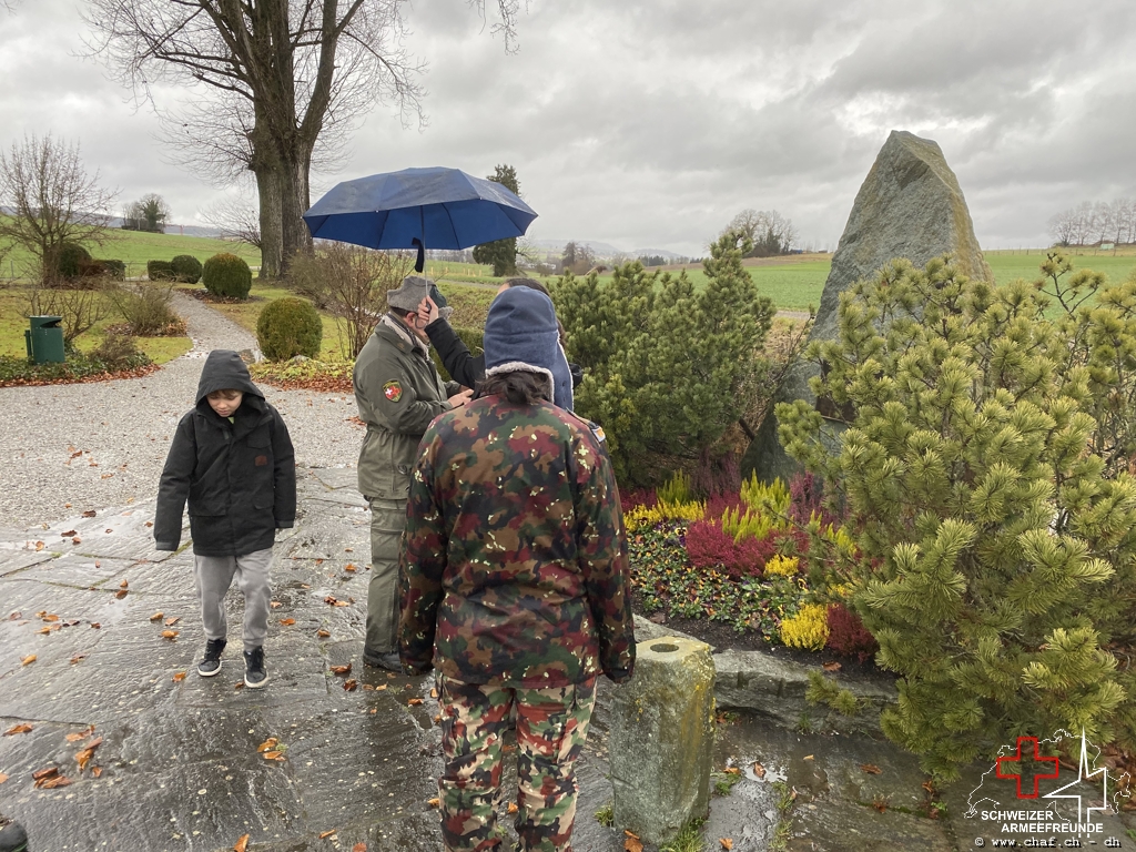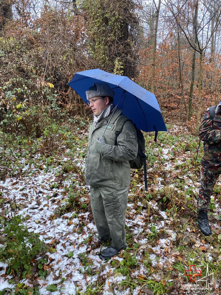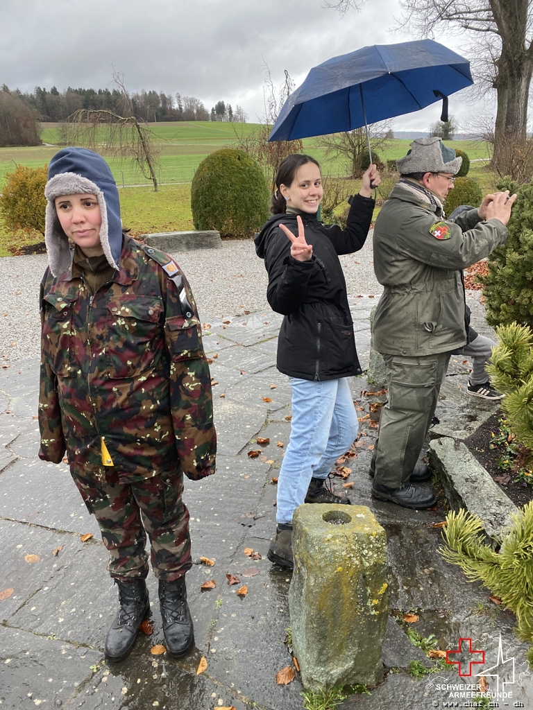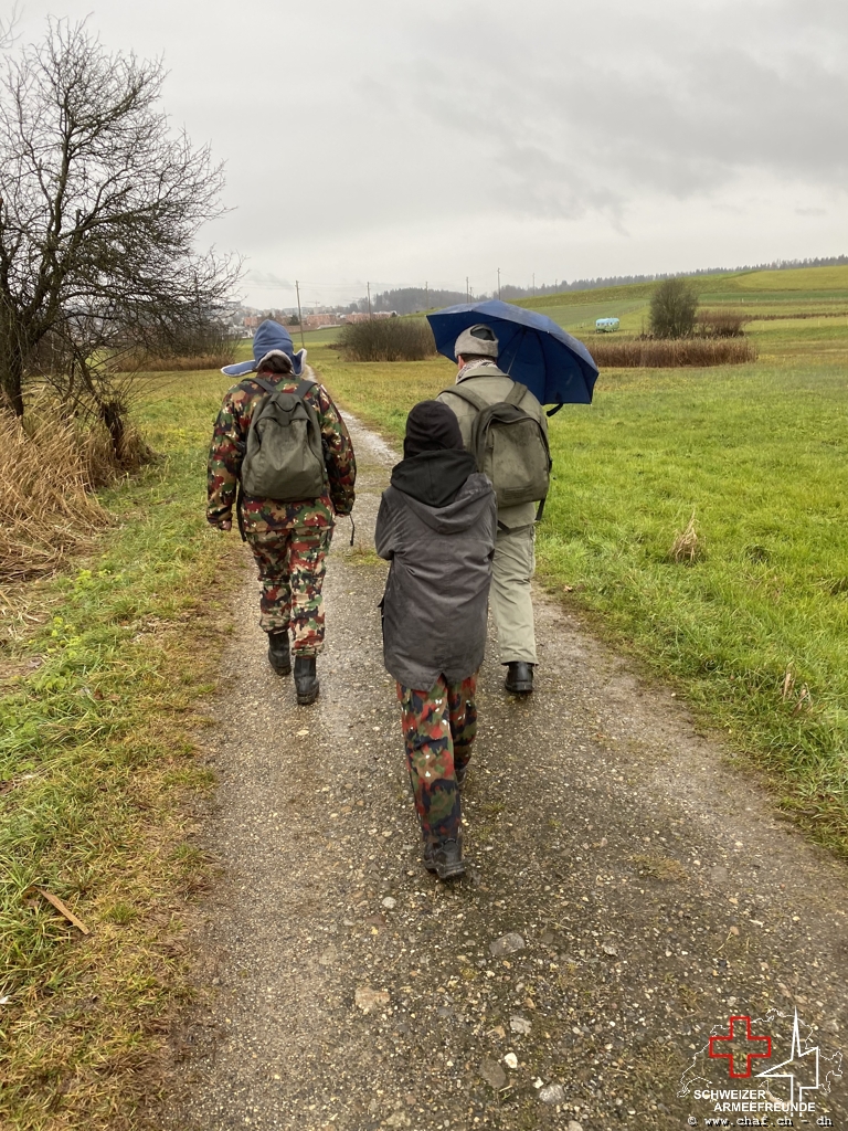 Bei nasskalter Witterung und Wind starteten die Drei um 09hunder in Oberglatt und marschierten Richtung Zürich-Affoltern, wo sie die Gedenkstätte des Militärpiloten Paul Treu besuchten. Auch befand sich dort der erste Verpflegungsposten mit einem feinen Gulasch und «Kaffi Lutz», was bei diesem Wetter eine wahre Wohltat war.