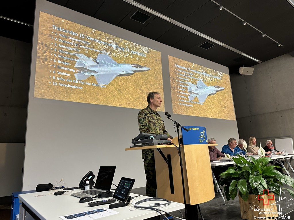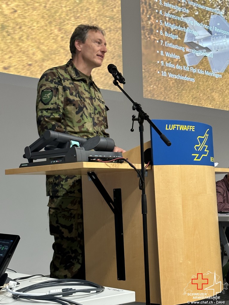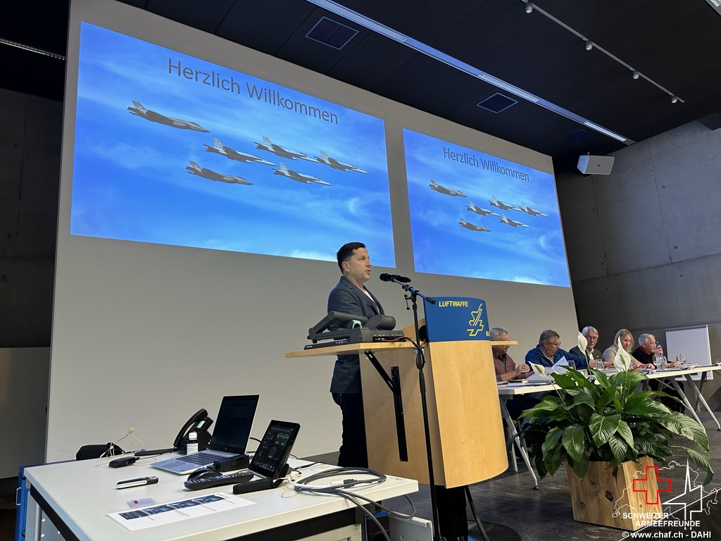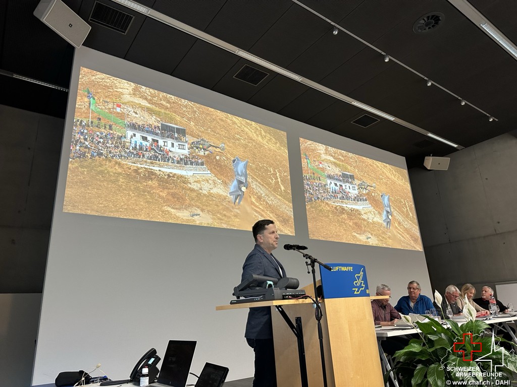 Nach dem offiziellen Teil, der Generalversammlung, kammen wir in den Genuss eines Kurzvortrages unseres Luftwaffenchefs Peter Merz, mit dem nachfolgenden Vortrag des PC-7 Piloten Hptm Andri Gaudenz “Gaudi”, der uns einiges über diese coole Staffel, deren Auftrag und weitere interessante Fakten erzählte.